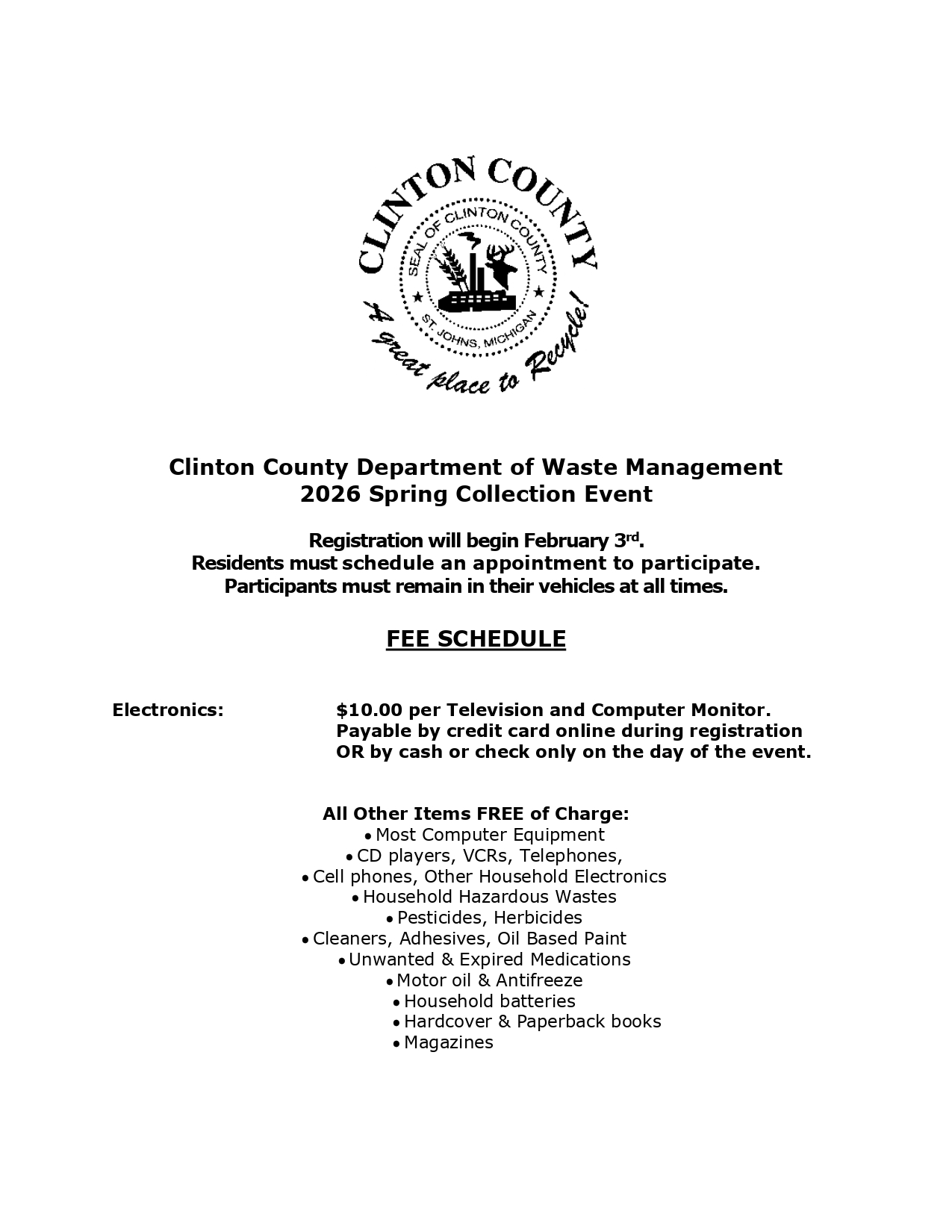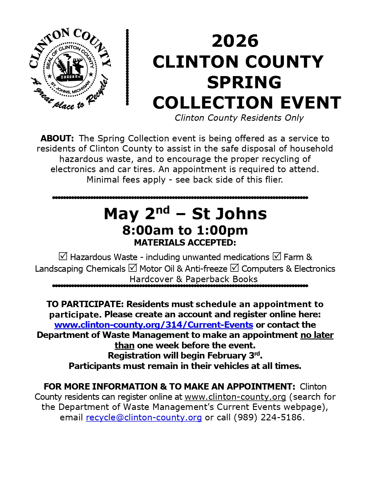 Posted on February 11, 2026, Edited February 11, 2026 by ana 2026 Clinton County Spring Collection Event